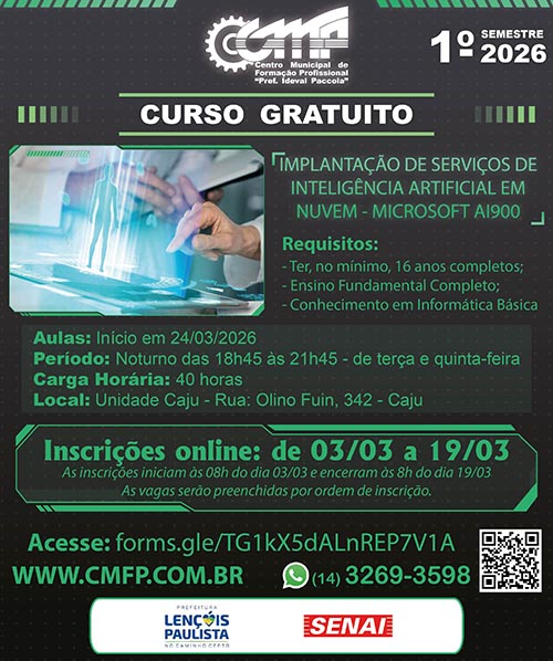 Faça sua Inscrição AQUI 1º Semestre 2026 - IMPLANTAÇÃO DE SERVIÇOS DE INTELIGÊNCIA ARTIFICIAL EM NUVEM - MICROSOFT AI900