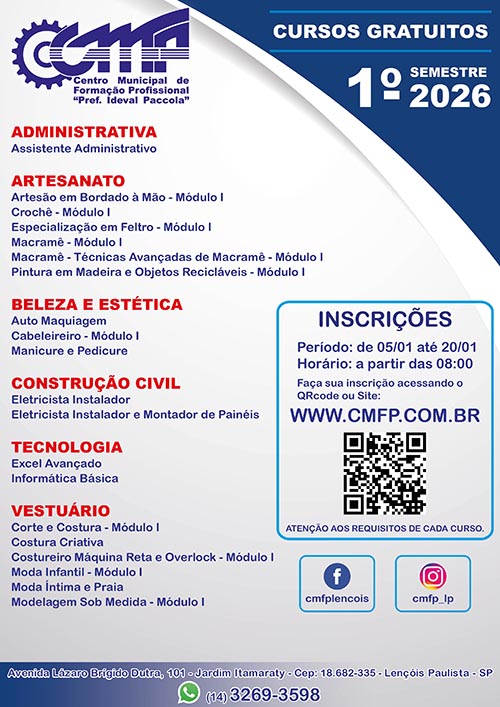 O CENTRO MUNICIPAL DE FORMAÇÃO PROFISSIONAL “PREFEITO IDEVAL PACCOLA”, no uso de suas atribuições, faz saber que será realizado o PROCESSO DE INSCRIÇÕES ONLINE de 05 de janeiro até 20 de