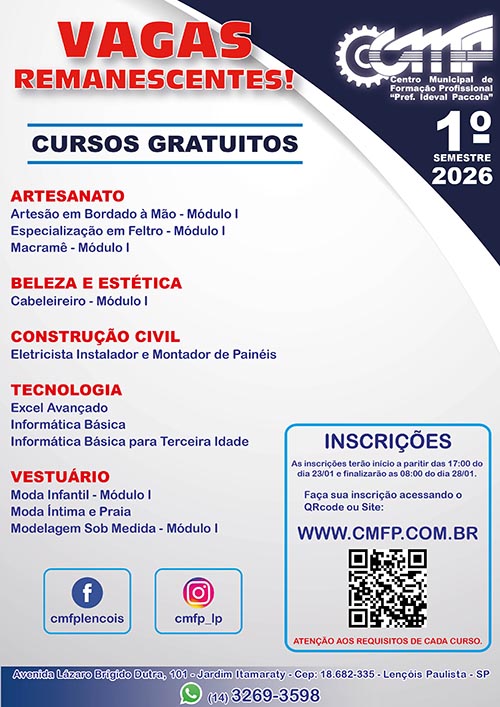 O CENTRO MUNICIPAL DE FORMAÇÃO PROFISSIONAL “PREFEITO IDEVAL PACCOLA”, no uso de suas atribuições, faz saber que será realizado o PROCESSO DE INSCRIÇÕES ONLINE VAGAS REMANESCENTES de 23 de janeiro até 28 de